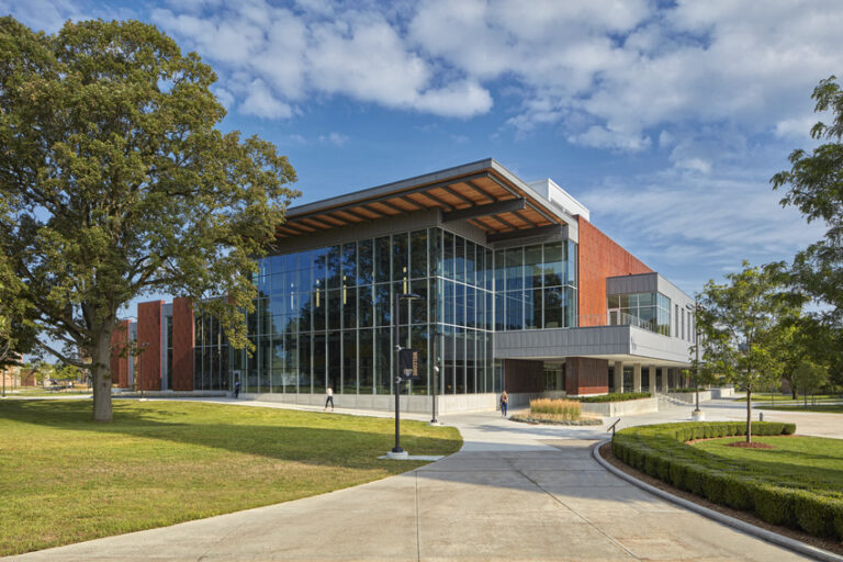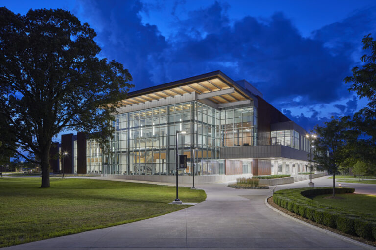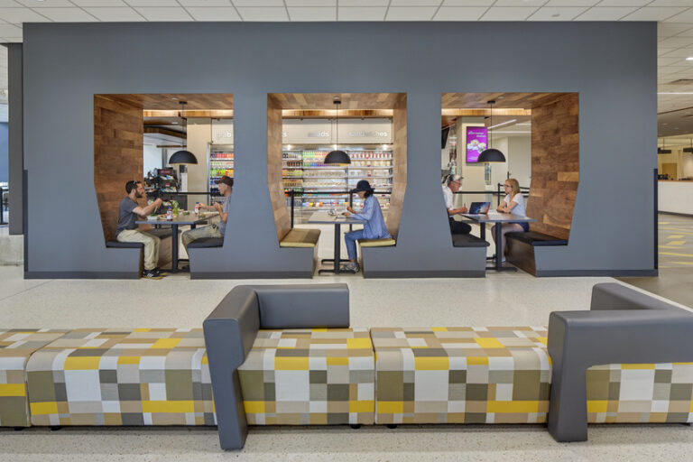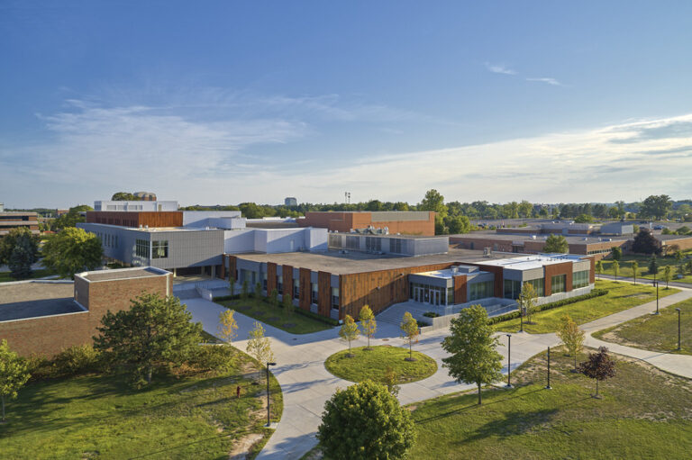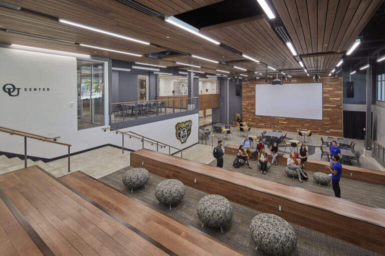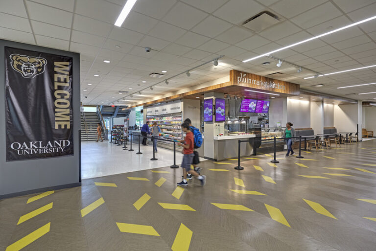 This addition and renovation shifted student activity to the perimeter of the building while moving office spaces to the center of the building, making student life more visible from the outside. Renovations included the construction of a tiered floor plan with higher ceilings to create a more open atmosphere. Tiered seating created new spaces for study, leisure and group meetings. With many student organizations are housed in the basement of the building, visual connections were made between the basement and ground floor to reduce the sense of separation between areas. On the upper level, two new multipurpose areas were added for larger events. To support improved functionality in the dining area, backhouse areas were upgraded to make daily functions more effective. Work was completed on a 16-month schedule while the Oakland Center remained fully operational, challenging the team to complete construction in phases. The team focused on maintaining clear communication through signage and project updates to ensure a safe environment for the students, staff and University community members during the project.