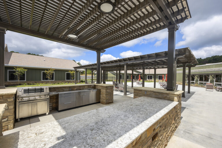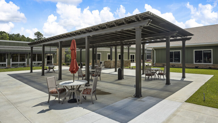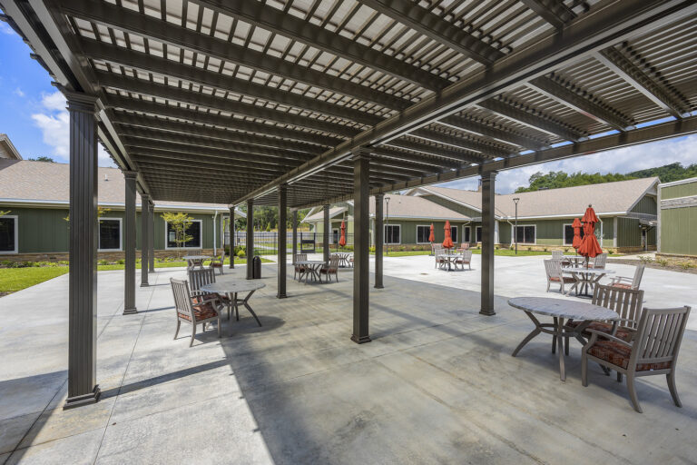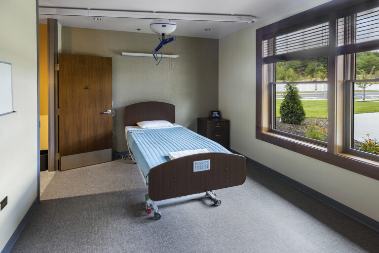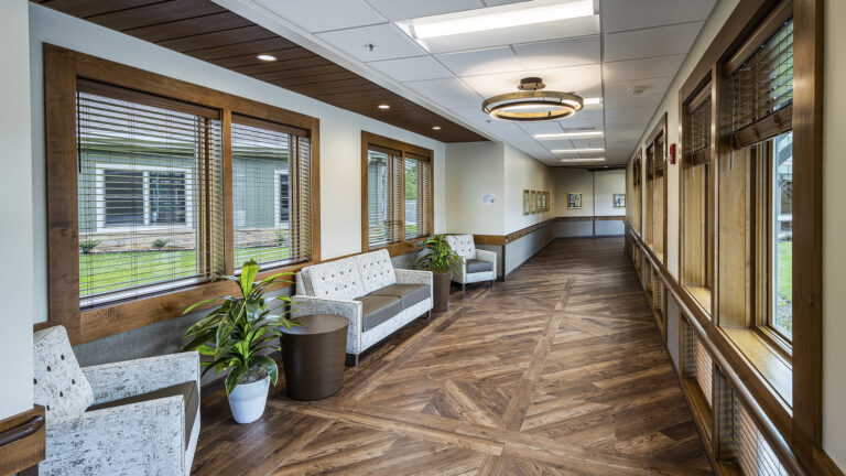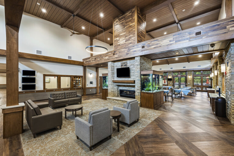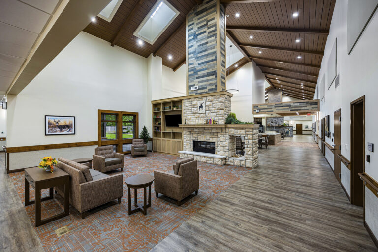 The $47 million facility has six distinct but connected communities, and each is represented by an animal native to the area including a bear, fox, hawk and raccoon. The animals help patients orient themselves and add to the lodge theme for the facility, which also includes a state-of-the-art therapy gym and courtyards with country views.
