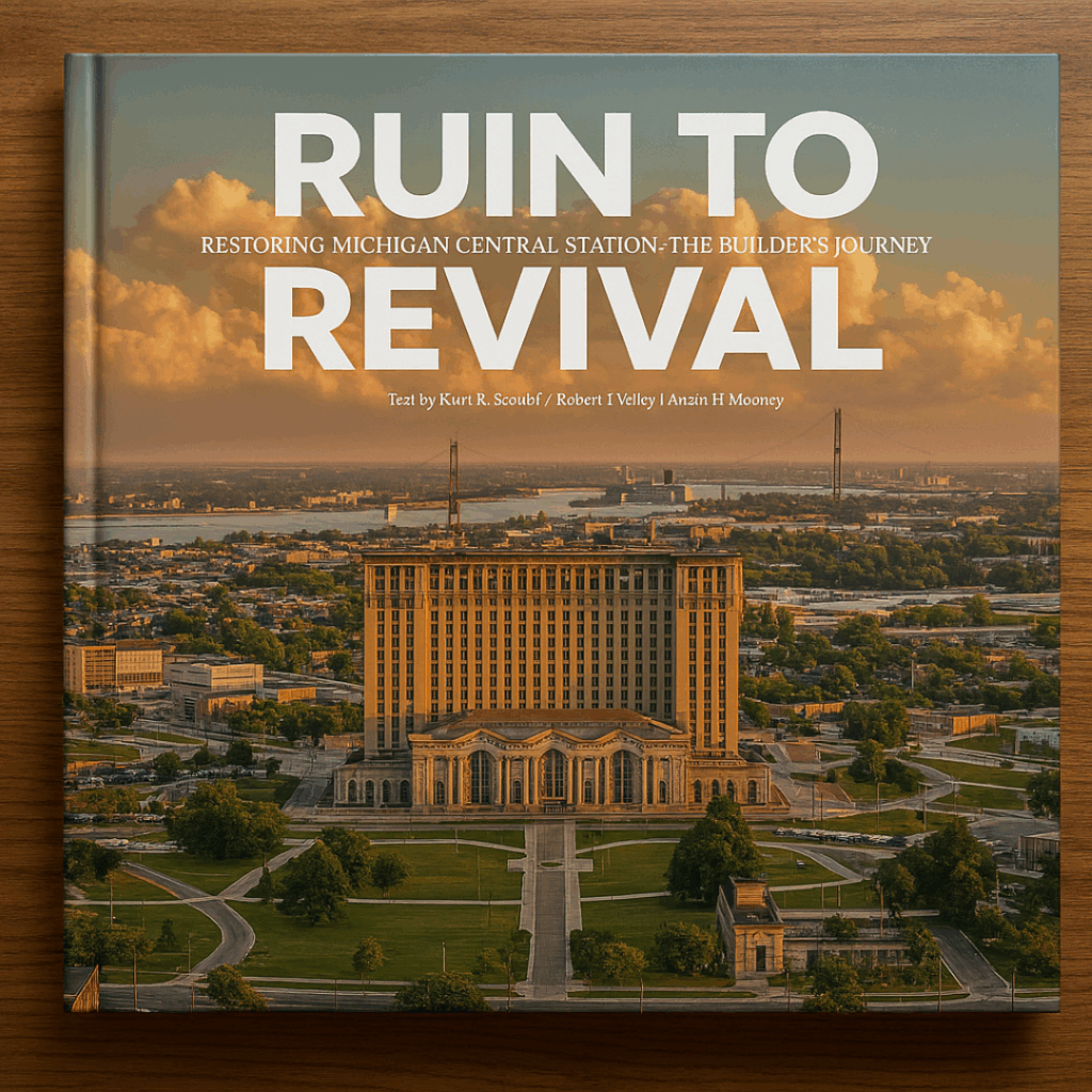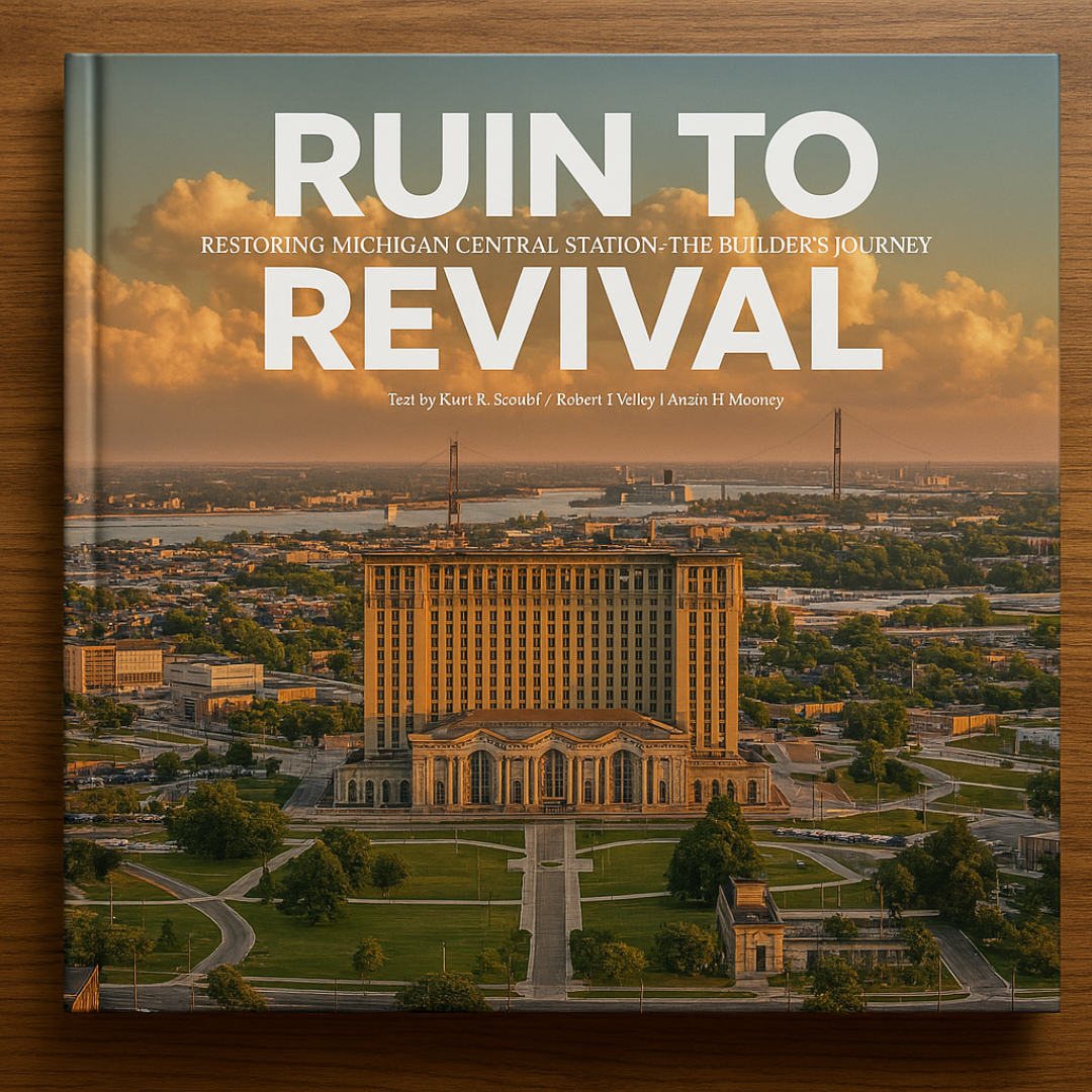 From a symbol of Detroit’s decline to a beacon of its rebirth, Ruin to Revival chronicles the extraordinary restoration of Michigan Central Station through the eyes of the builders who brought it back to life. This visually rich coffee table book takes readers behind the scenes of one of America’s most ambitious preservation projects. It explores the meticulous planning, the safeguarding of historic architectural elements, and the revival of the station’s elegant exterior and magnificent interior.