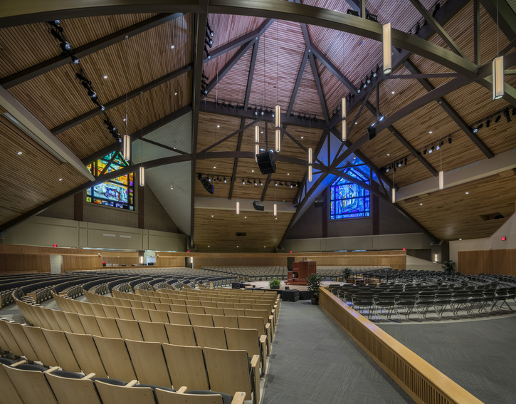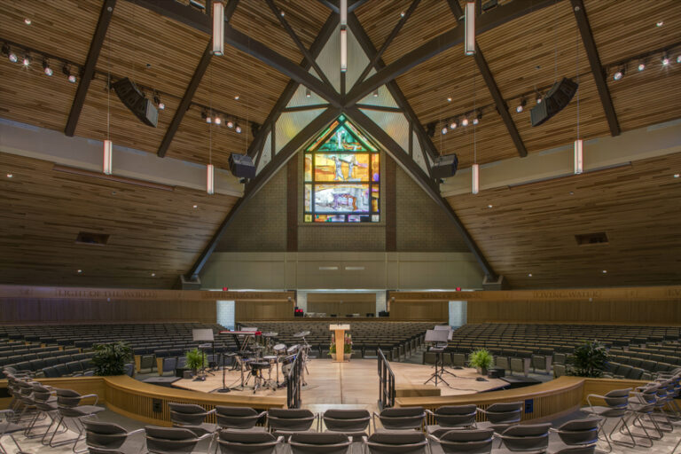 Cornerstone University had been holding weekly chapel services in a variety of temporary locations throughout the years, including gymnasiums, classroom buildings and nearby churches. With chapel serving as a key part of campus life for students, staff and faculty, this legacy project was a significant milestone in the University’s history. The design intent for the project was to create a transcendent structure with a dramatic, open ceiling. The new space features a magnificent open structure with clear span bowed trusses. Made possible by a local benefactor, four large stained glass windows serve as focal points on every side of the chapel, telling the story of the resurrection. The building features state-of-the-art acoustical treatments, audiovisual equipment and high technology capabilities, allowing for accommodation of a wide variety of activities in addition to chapel services. Connected to the chapel is Gordon Hall, which received new high technology practice and recital rooms for music studies.