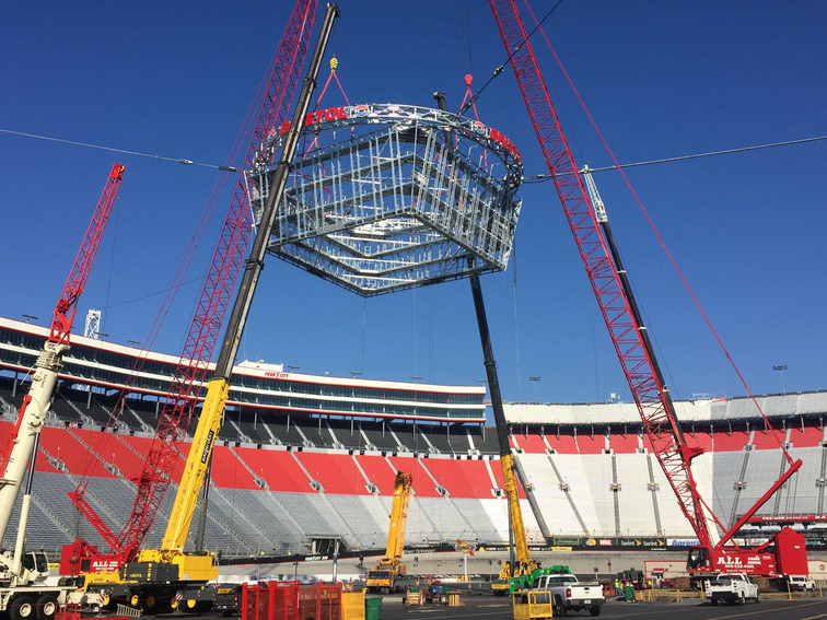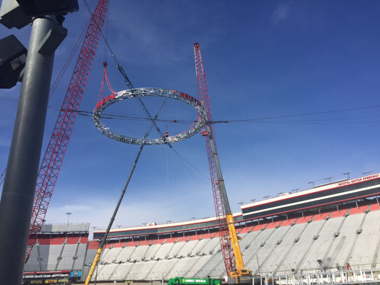 This monumental project was spurred by the opportunity to host the historic "Battle at Bristol," the largest college football game in history. To accommodate the football field, the existing pylon-style scoreboard at midfield was replaced, and Colossus, a four-sided behemoth, now stands as a permanent fixture, adding a unique and spectacular dimension to the speedway's event experience. The construction of Colossus presented an array of challenges for the project team, given the complexities of the site, structural system, and the absence of a roof structure for traditional hanging methods. Meticulous planning and close collaboration were essential for this fast-paced project, particularly during the unpredictable winter months in northeast Tennessee. The team coordinated major crane lifts, implemented innovative safety solutions and held pre-lift meetings and huddles to ensure flawless execution.