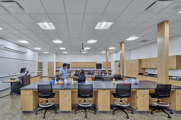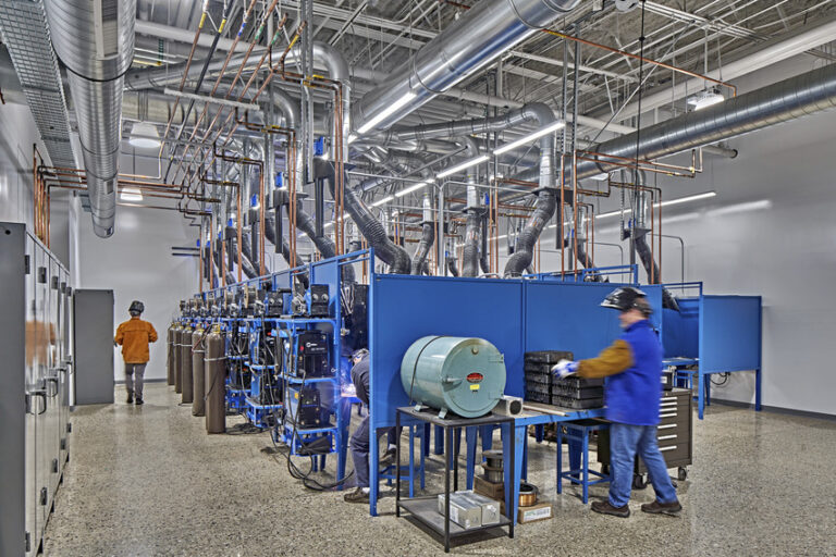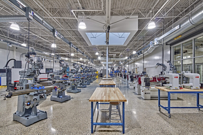 This project consolidated resources and programs from four separate locations into one facility, providing convenient access to public transportation, employers and student services. The College acquired the former JCPenney in The Shops at Westshore Mall to establish its Lakeshore Campus, which is dedicated to serving learners of all ages in the area. This move created opportunities for operational efficiencies and partnerships with other area colleges. The facility features nine classrooms, four computer labs and five specialized labs. It also includes spaces for advising, counseling and other student support services, along with a satellite library and areas for community use. To enhance the student experience, a variety of study areas are available, ranging from cubicle-style couches and chairs embedded into the walls to private five-person meeting rooms, each equipped with a TV. The exterior of the building was completely transformed, establishing a modern, welcoming presence while salvaging as much of the existing structure as possible to maintain the project within budget.