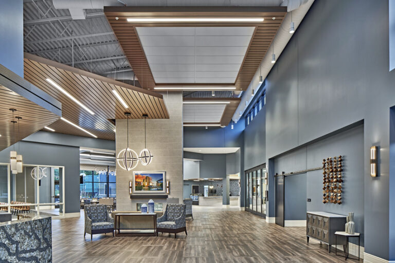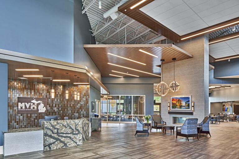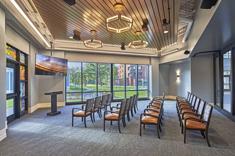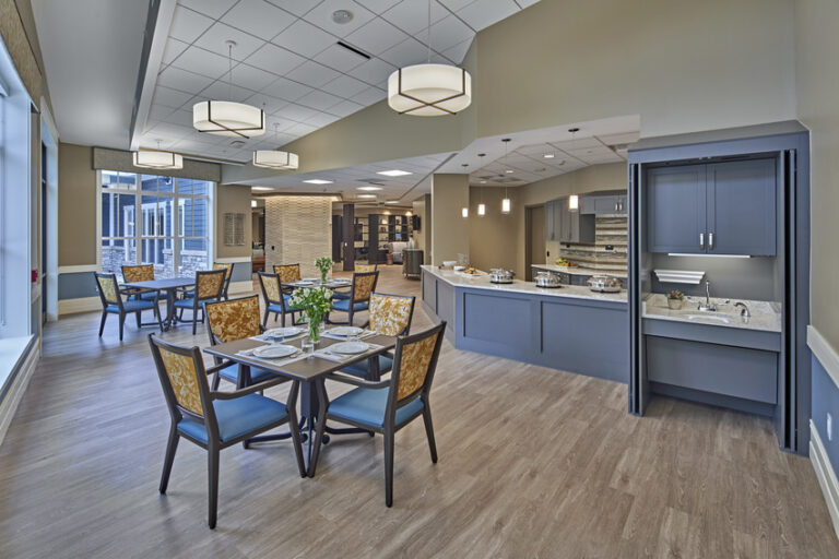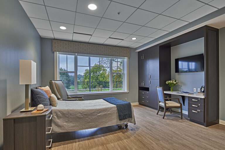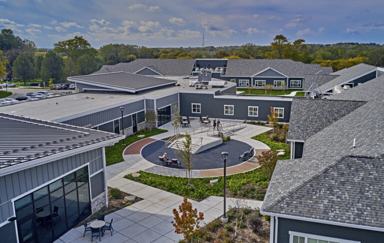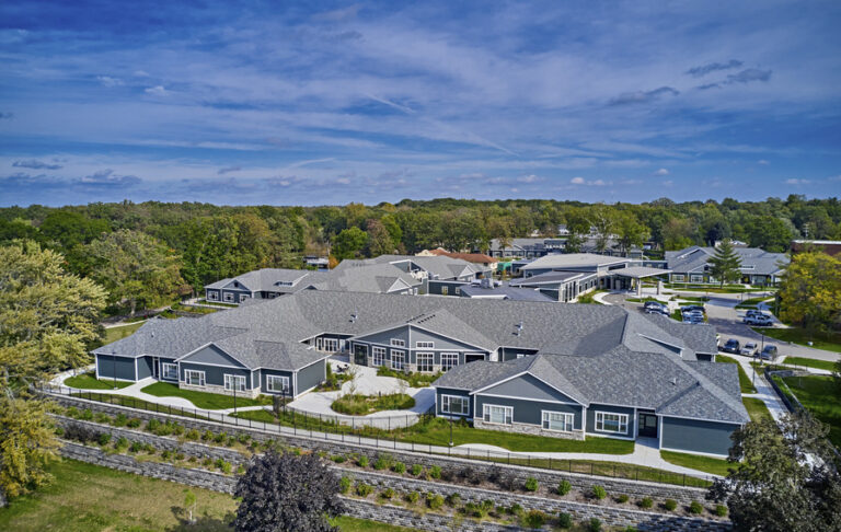 This new home features a small house concept that houses 128 residents in a modern, home-like setting and provides state-of-the-art care. Each occupant has their own bedroom and bathroom, with access to common gathering and kitchen spaces. Four neighborhoods connect to a main community center with clinics and therapeutic services. Other amenities include larger spaces for community meetings, courtyards and green spaces, and a barber shop and hair salon. All buildings are connected via heated and air conditioned corridors, allowing members to move through the neighborhood buildings and community center while staying indoors. Every day, the extensive professional staff focuses on long-term and short-term care, rehab and therapy, dementia and memory care and palliative care. An in-house pharmacy, pastoral care and specialty clinics, such as dental and vision care, are also available.