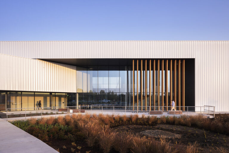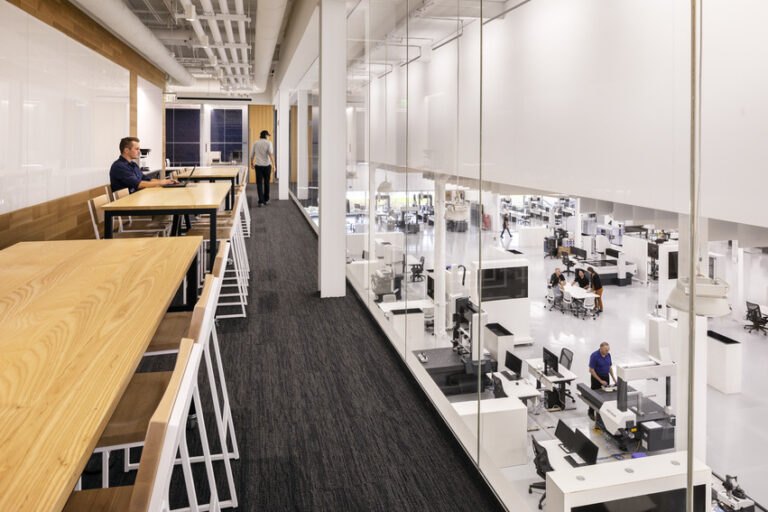 As an internationally leading technology enterprise operating in the fields of optics and optoelectronics, this new facility serves as the company's Michigan headquarters and consolidates four existing facilities into one location. The new building serves as a state-of-the-art multifunctional work setting with a focus on its customers. The two-story office building adjoins to a single-story showroom and high-bay lab area. It also includes an open purpose and dining area, warming kitchen, conference rooms, collaborative spaces, and customer training areas. With sensitivity to the surrounding area, the project team designed the new facility in a way that ensured the surrounding wetlands on the site would not be disturbed. Its placement on the site as well as the shape of the building supports this effort and preserves the wetlands. The back courtyard overlooks the wetlands, providing building users with a view of the natural area. The exterior of the building is visually appealing with a glazed curtainwall and metal panels.