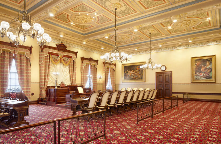 Utilizing original construction plans, previous restorations and modern expectations of a functioning office building and exhibit space, this project fully restored the 19th century facility. The team used photographic and documentary evidence from an 1878 redecoration and restoration project directed by Baltimore architect George Frederick to restore the decorative and ornamental plaster; decorative paint; detailed bronze light fixtures; install custom woven wool carpet and custom woven wool and silk drapes; and provide custom millwork on the dais, as well as the desk of the Speaker of the House. During the restoration, 43 delegate desks were fabricated to match the original period. In addition, a mist fire sprinkler system was installed, which utilizes 1/15 of the water of a standard fire protection system, which will protect the historic fabric and artifacts in the case of a fire. Modern audiovisual equipment was also installed.