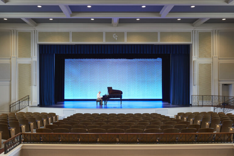 An extraordinary component of this expansion was the 338-seat auditorium designed specifically for seniors. Instead of a typical flat-floor multipurpose room, Well-Spring wanted a space where all members of the audience would be able to see and hear as well as possible, and with the ambiance of a high-quality performing arts venue. The theater is a space where residents can participate in and attend memorial services, educational talks, performances, resident/staff meetings, and more. Another key part of the project involved re-envisioned dining services. Where before there was one traditional dining room with wait service, it now features a bistro with an open kitchen and a market-stall service approach for casual dining. Additionally, corridors and connections were opened up to facilitate flow and better accommodate a wide range of mobility in residents. A central open space became a comfortable landing spot with lounge and casual seating.
