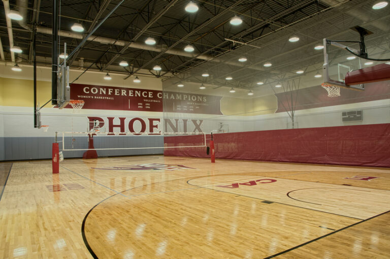 The largest facility on campus, this arena is home to the Phoenix basketball and volleyball teams and includes a spacious entry atrium, a large practice gymnasium, locker room and team facilities, and a hospitality room for special events. The new building tripled the capacity previously accommodated at the existing alumni gymnasium. Working on a fast-paced schedule, Christman completed the building a full four months ahead of schedule. The project team continued working on site to complete owner-issued change orders, including extra touches that make the Schar Center all the more inspiring. Having the project done early allowed the University to begin using the facility prior to the fall semester, which allowed for numerous athletic recruits to visit the impressive new space.