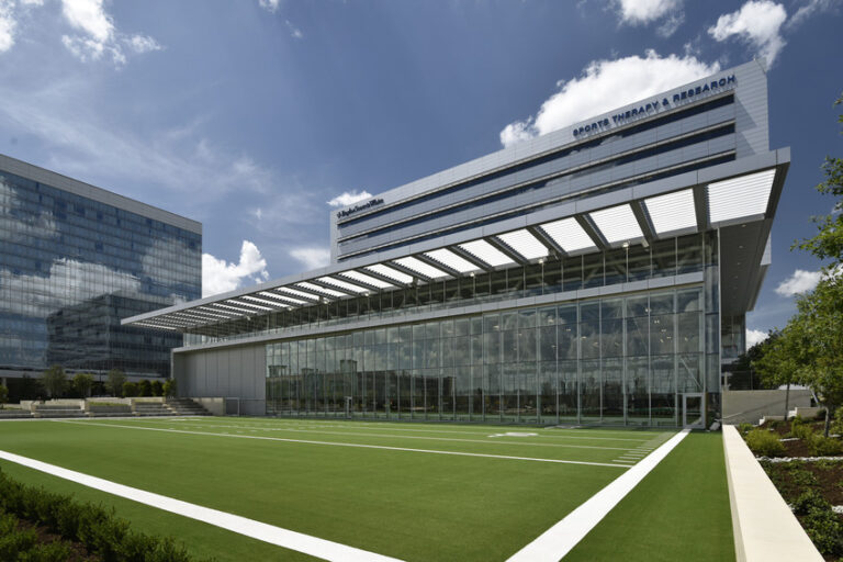 This facility focuses on sports performance and injury prevention to provide patients access to equipment and services used by elite athletes. The 11-story building is home to a variety of specialized centers including an ambulatory surgery center, diagnostic imaging center, urgent care center, outpatient rehabilitation, sports concussion center, pharmacy, sports performance center, and research center. Also included on site is a six-story parking deck connected to the main building.