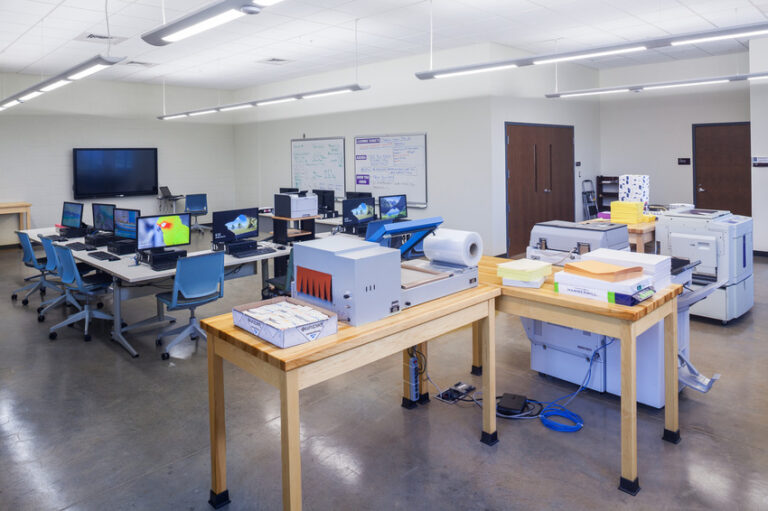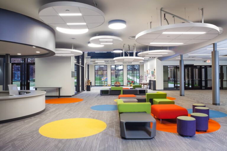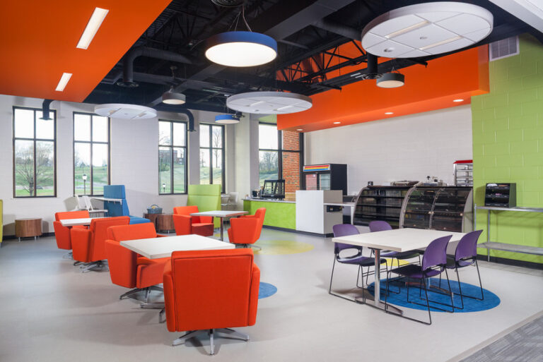This project focused on improving the overall experience and opportunities for students and staff. The new classrooms offer collaborative spaces that focus on sight lines and incorporate numerous design features to enhance the space for communicating in sign language. Also included in the project was construction of a separate dining hall that serves up to 250 for dining and up to 500 for special events. The dining hall includes an outdoor patio for eating and socializing that overlooks the pedestrian quadrangle. The program for the high school also includes post-secondary preparation and work-based learning opportunities for students that include administrative assistance, a school store, and a cafe that serves food prepared by the culinary arts program that reside in the dining hall.