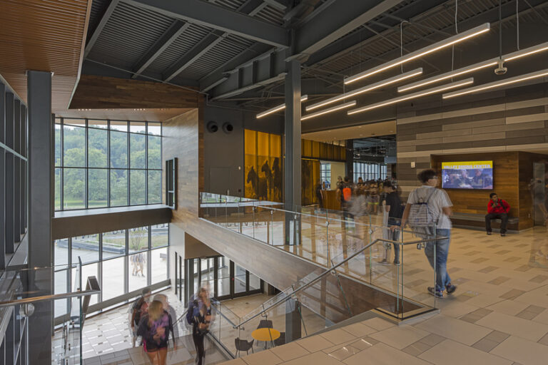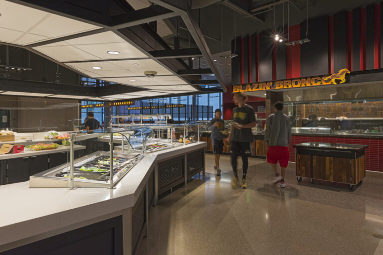 With a goal of providing students, staff and guests with a blend of housing and dining that enhances social interaction and appeals to all kinds of students, the University chose to construct the impressive new Valley Dining Center. The state-of-the-art dining venue serves 3,000 students occupying the adjacent Valley residence halls. The two-story wood and steel framed facility houses an upper-level open plan main floor dining area with a variety of venue options and a lower level with back-of-house functions and retail cafe. The facility is designed to provide students and guests with a contemporary food venue featuring kiosk-style cooking and clearly visible preparation areas. The design of the building also enhances pedestrian activity and safety while respecting scenic features and ecologically sensitive areas. A green roof and daylighting were implemented, while recycled materials were used during construction.