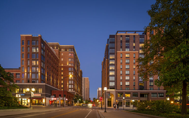 To support the growing demand for student housing in downtown Ann Arbor, this 13-story high rise provides modern, amenity-rich apartments in a highly walkable downtown near the University of Michigan. The client’s goal was to create a vibrant living environment with integrated retail and fitness options while navigating a constrained urban site surrounded by operational buildings. Christman was selected for our experience managing complex urban infill projects and our ability to deliver quality projects on tight timelines. The result is a high-performance residential building that blends seamlessly into the fabric of the South University corridor while offering a premium living experience for its residents. Spanning over 250,000 SF, the building includes 127 apartment units and 342 beds, plus two levels of underground parking, totaling 68 parking spots, and ground-floor retail and fitness spaces. Amenities such as study lounges, a game room, and a rooftop lounge with grilling stations foster community among residents. To maintain schedule despite the tight site conditions, we used panelized cold-formed metal framing with precast stair and elevator cores—accelerating structural erection and improving site logistics.
